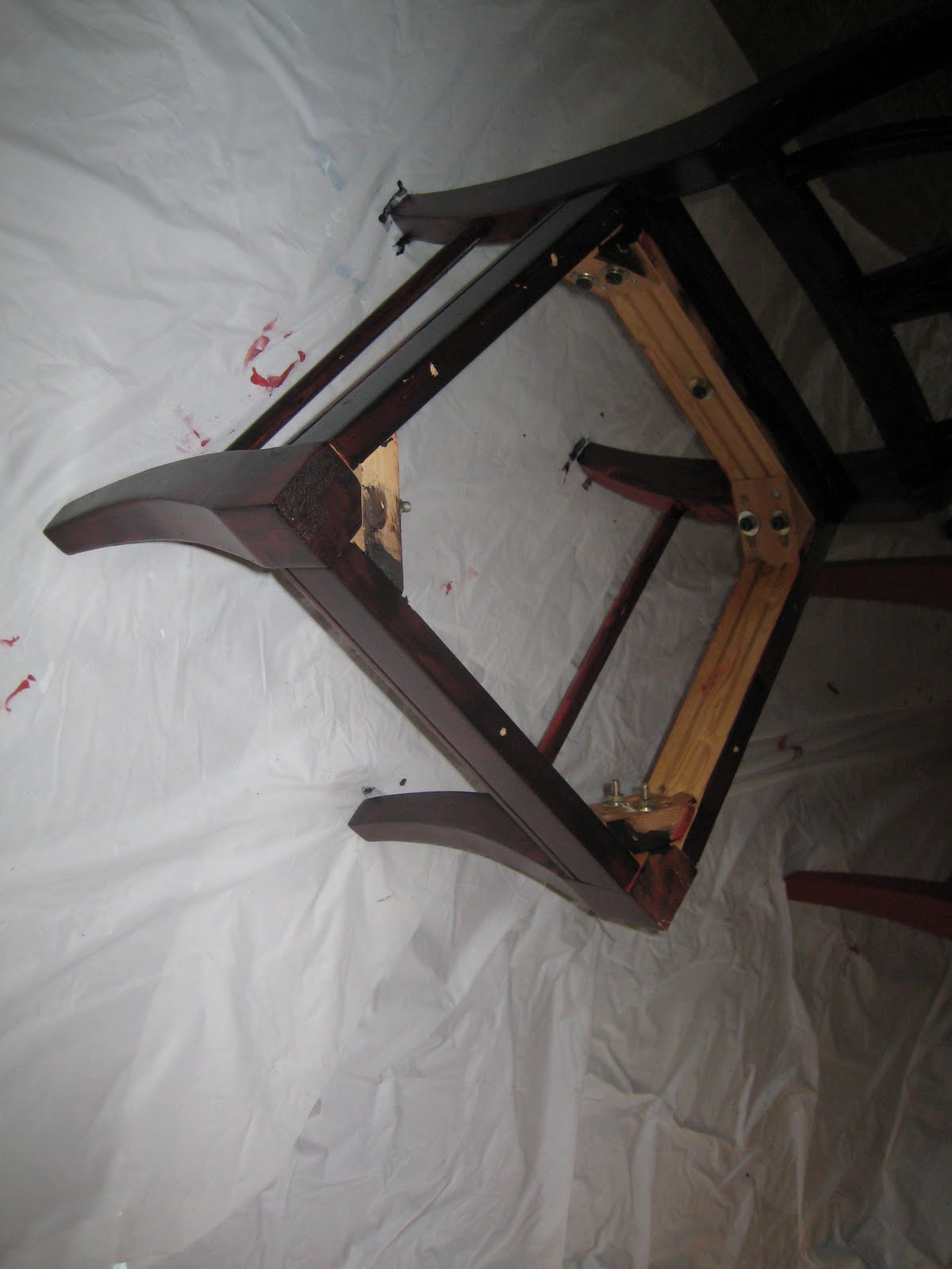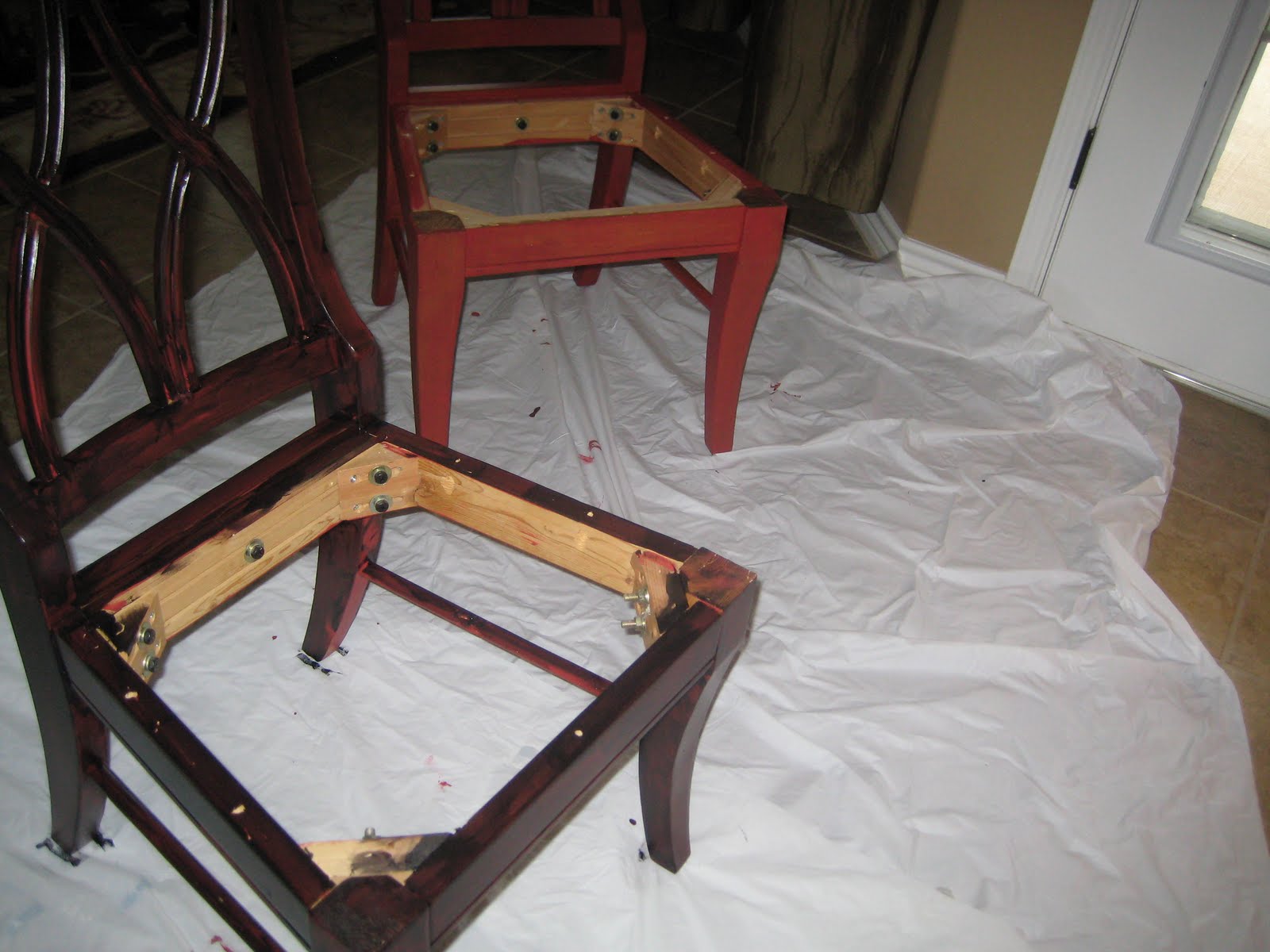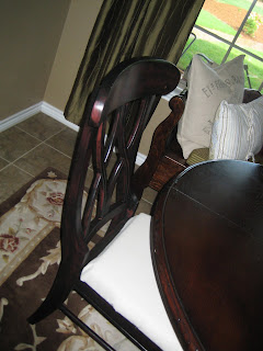 For temporary chair seats I just used pieces of a Home Depot paint drop cloth. I didn't even take time to wash and soften it. It would've looked so much better if I had. Man, this is like showing my dirty laundry!