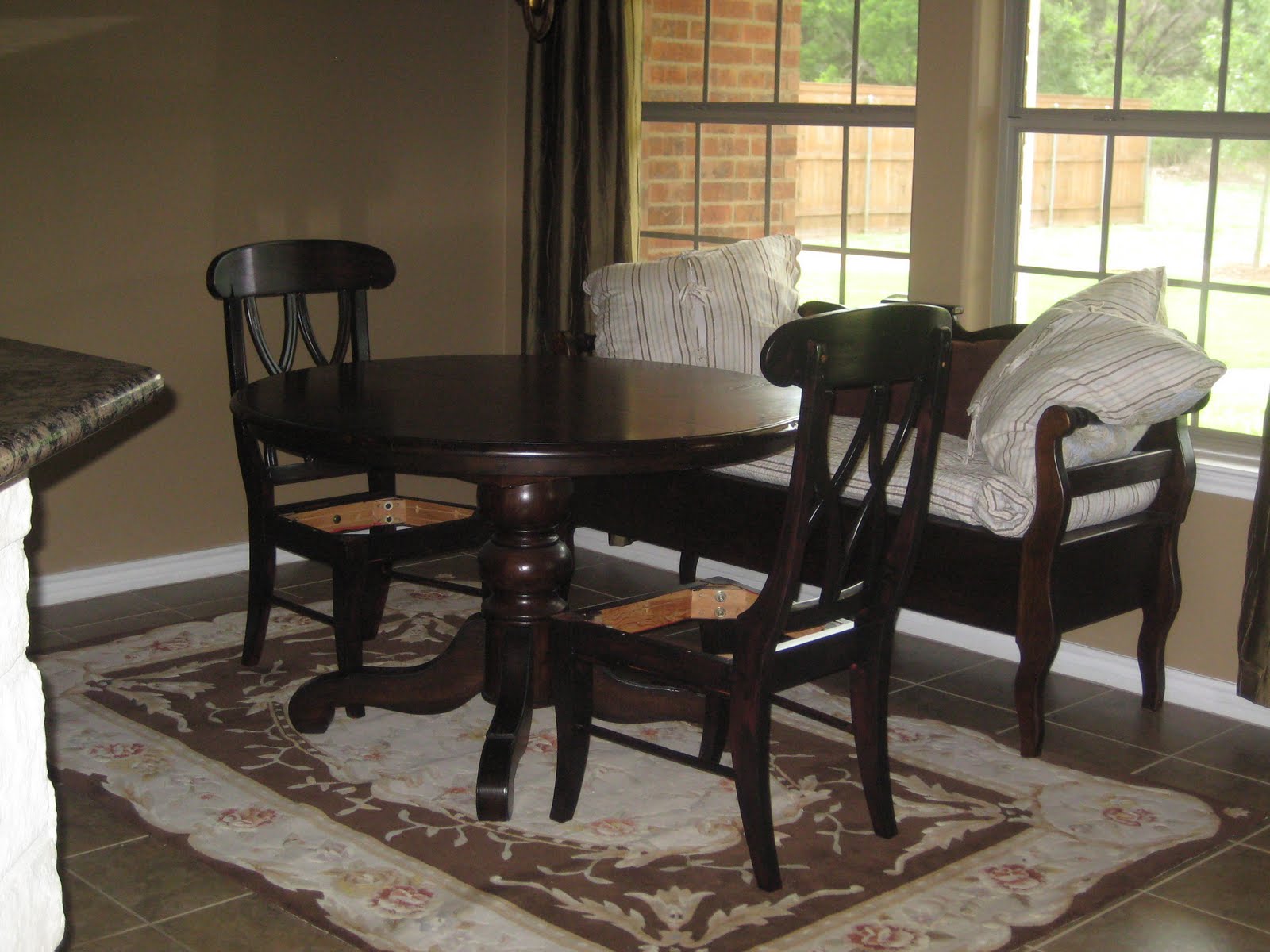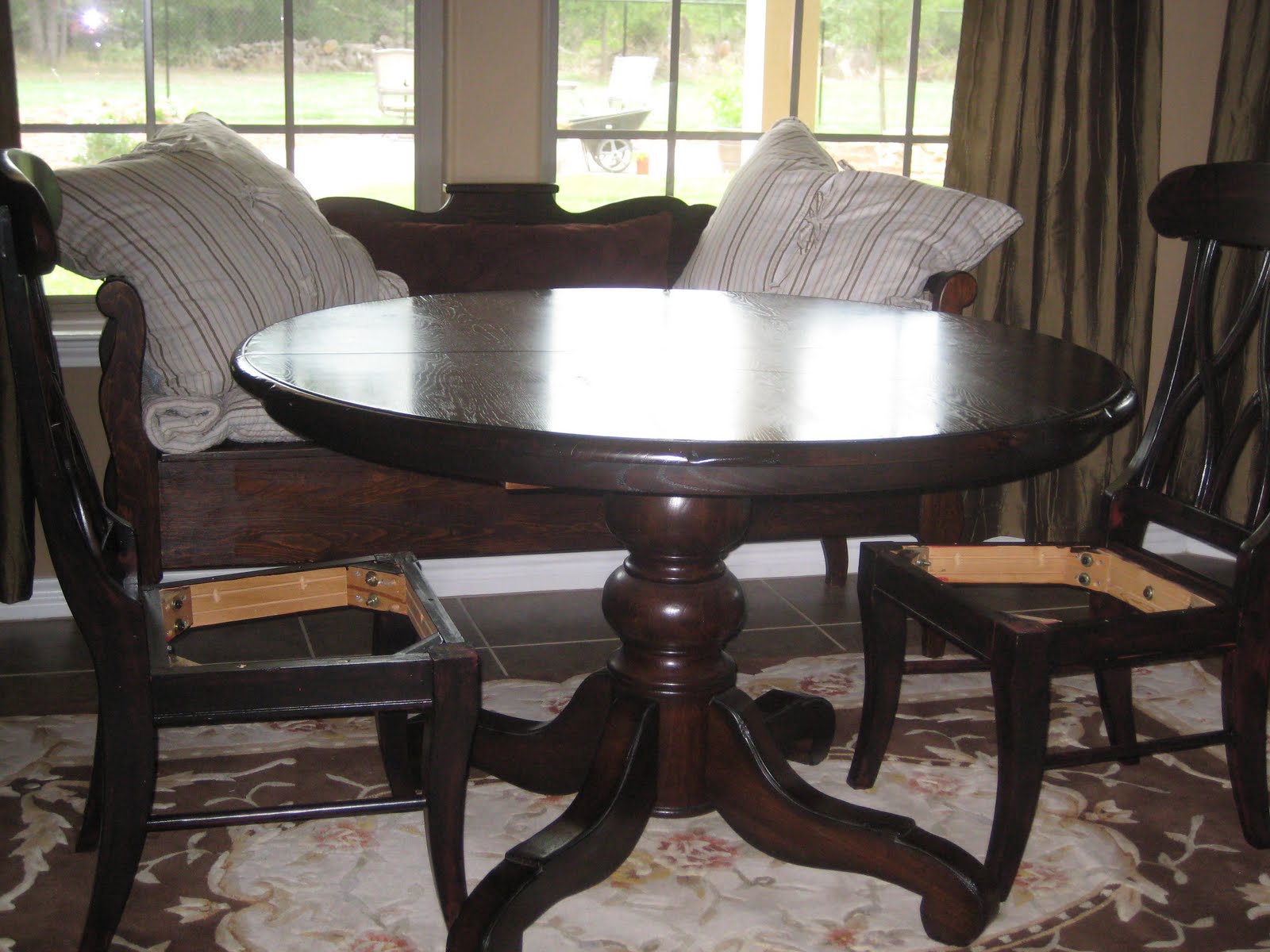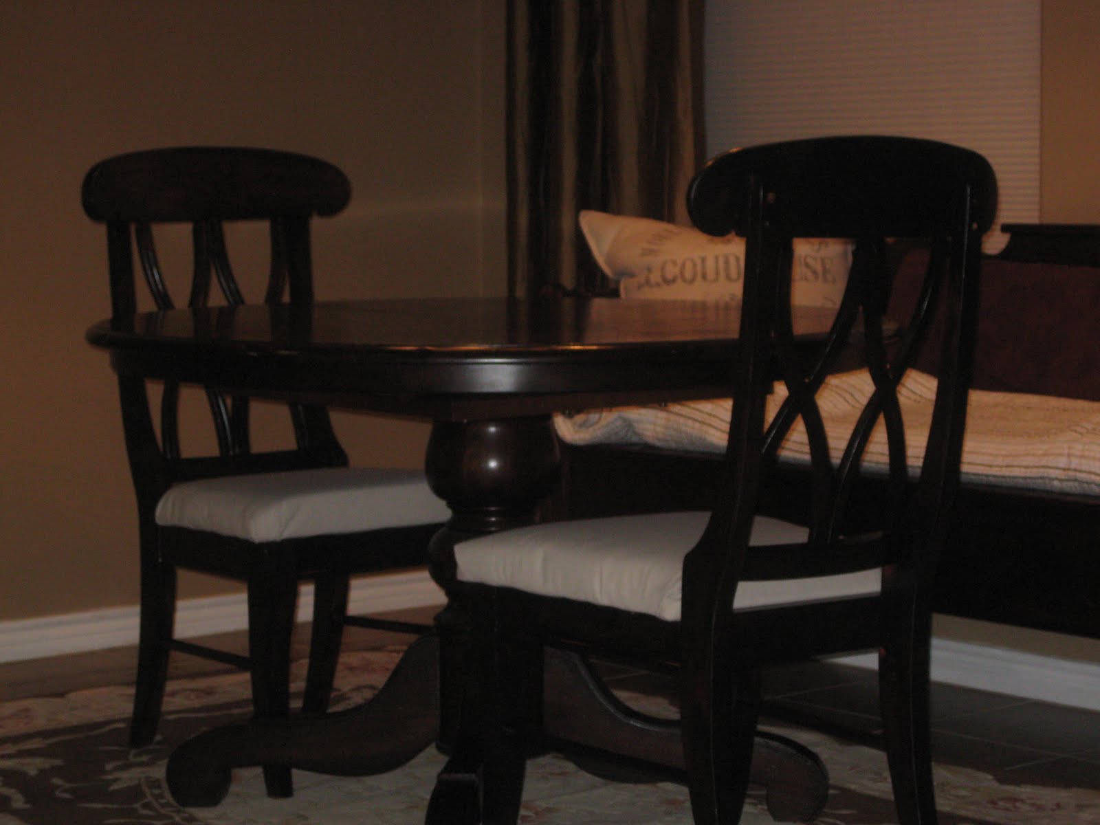 Even though I painted the chairs black, it amazed me how much they matched the table and a bench I already had, so I put them all together in the breakfast room. Now, I'm not the matchy-matchy type (this is an understatement)...but we had the house up for sale so I decided to leave the chairs looking brown.
