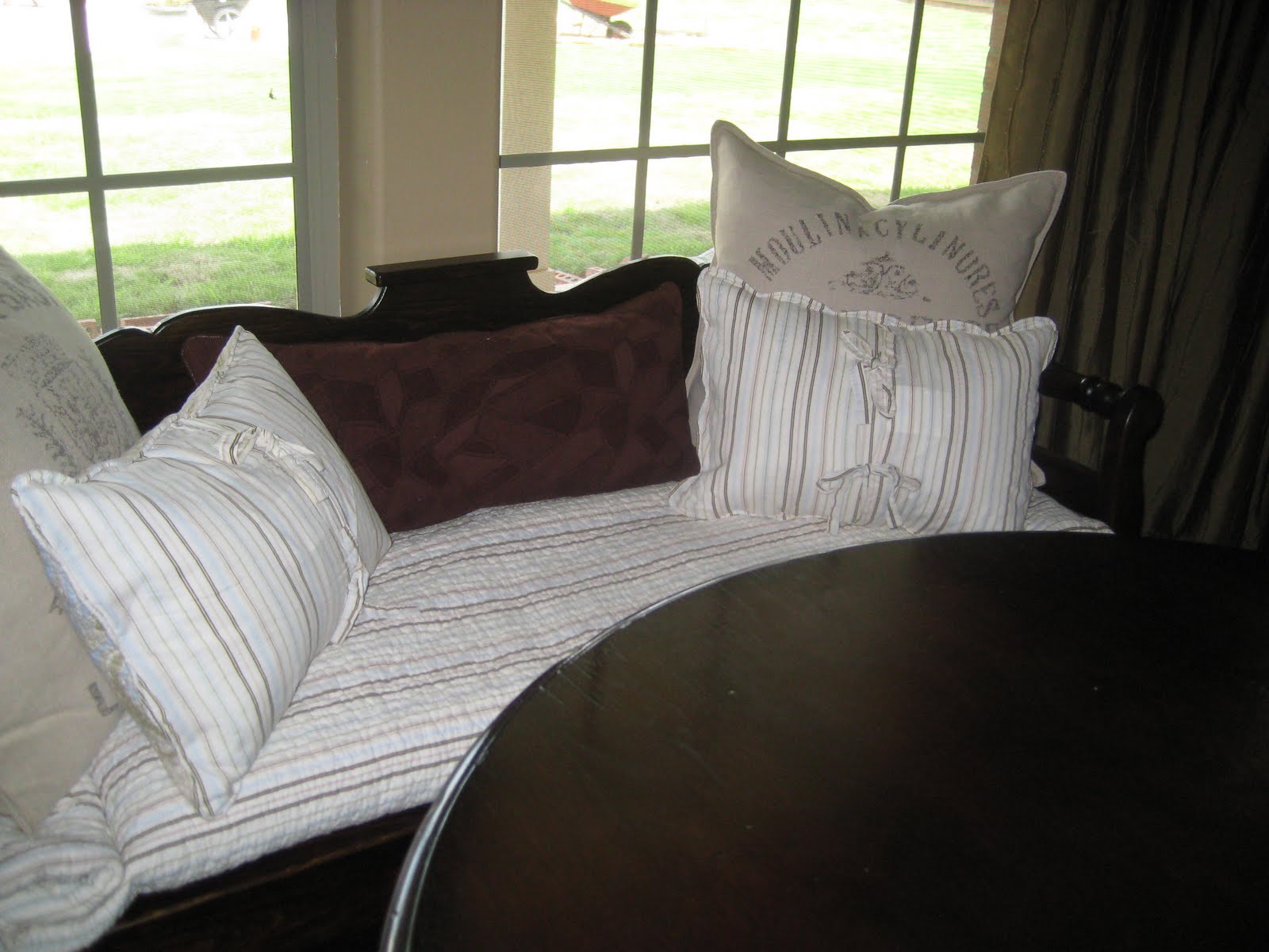 I made a make-shift bench cushion out of a king-size quilt I had, and put the matching shams on each end. These were another steal, by the way, from Marshalls.